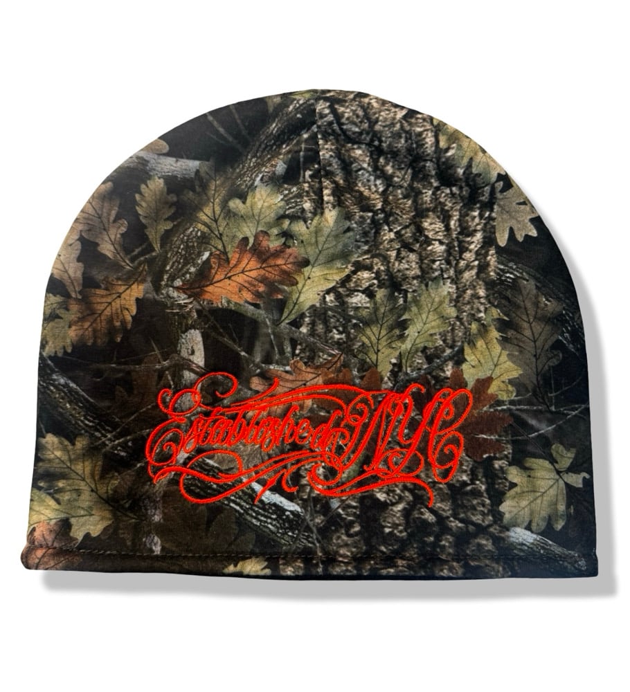 Our classic script “EstablishedNYC” logo embroidery on the front of a real tree camo skullie, using high visibility Safety Orange thread. A guaranteed cozy piece to warm you up in these cold streets. Highly limited, hand crafted with love at Established Screens in the BX, NYC