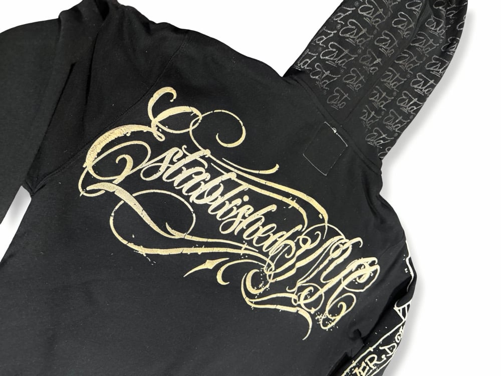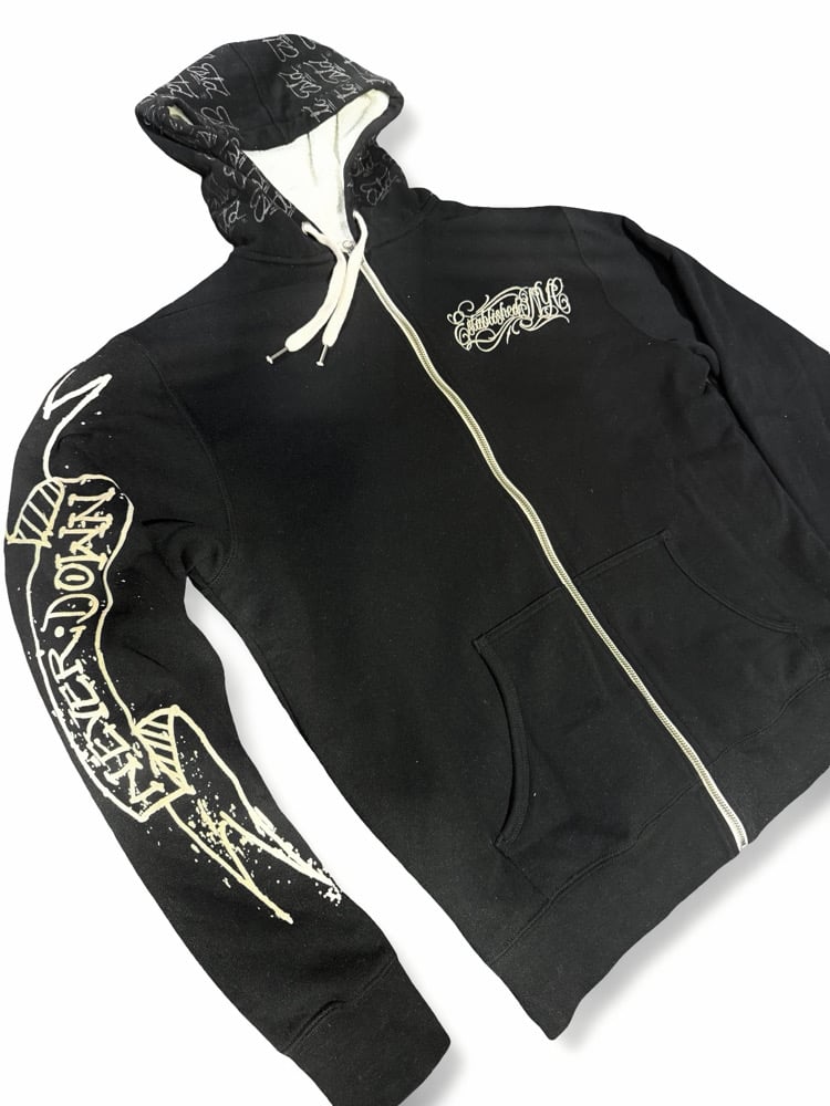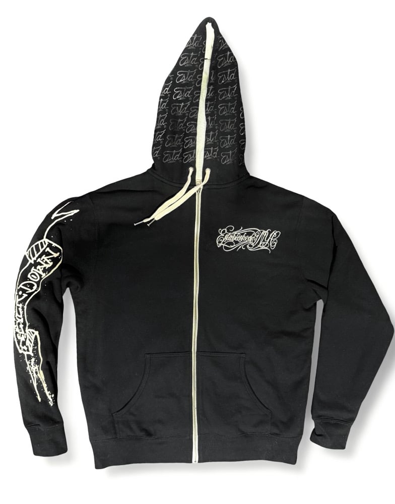 Looking for the perfect spring hoodie, our “All Over Script” Hoodie is the one. Extra cozy Sherpa lining, no need for a light coat, just grab this hoodie and your good to go. Featuring an all over printed Estd script hood, Large script logo embroidery on the chest, full “Never Down” screen printed sleeve hit, and oversized back Established Script logo 3D puff screen print. This piece is subtle and loud at the same time, guaranteed to keep you fresh. Made in NYC, with love, as always